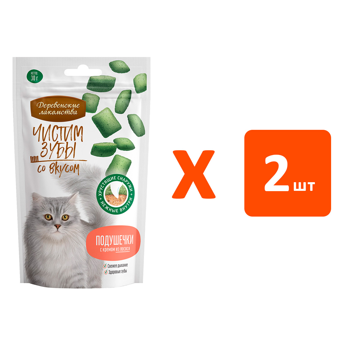 Лакомства для кошек ДЕРЕВЕНСКИЕ ЧИСТИМ ЗУБЫ подушечки с кремом лосось 30 гр (1 шт х 2)