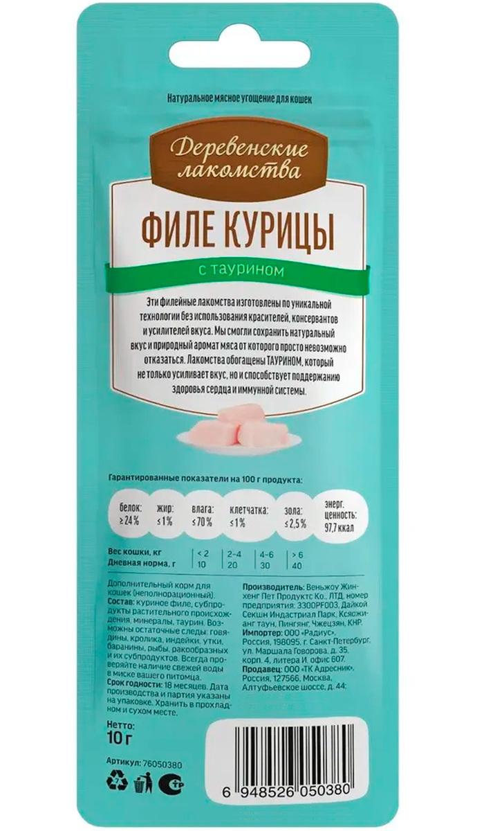 Лакомства для кошек ДЕРЕВЕНСКИЕ филе курицы нежное 10 гр (1 шт х 2)