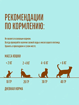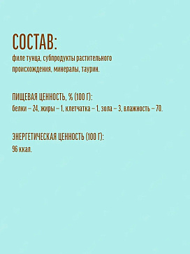 Лакомство обогащено таурином, который не только усиливает природный вкус, но и способствует поддержанию здоровья сердца и иммунной системы, а тунец содержит в себе кальций, фосфор и натрий.