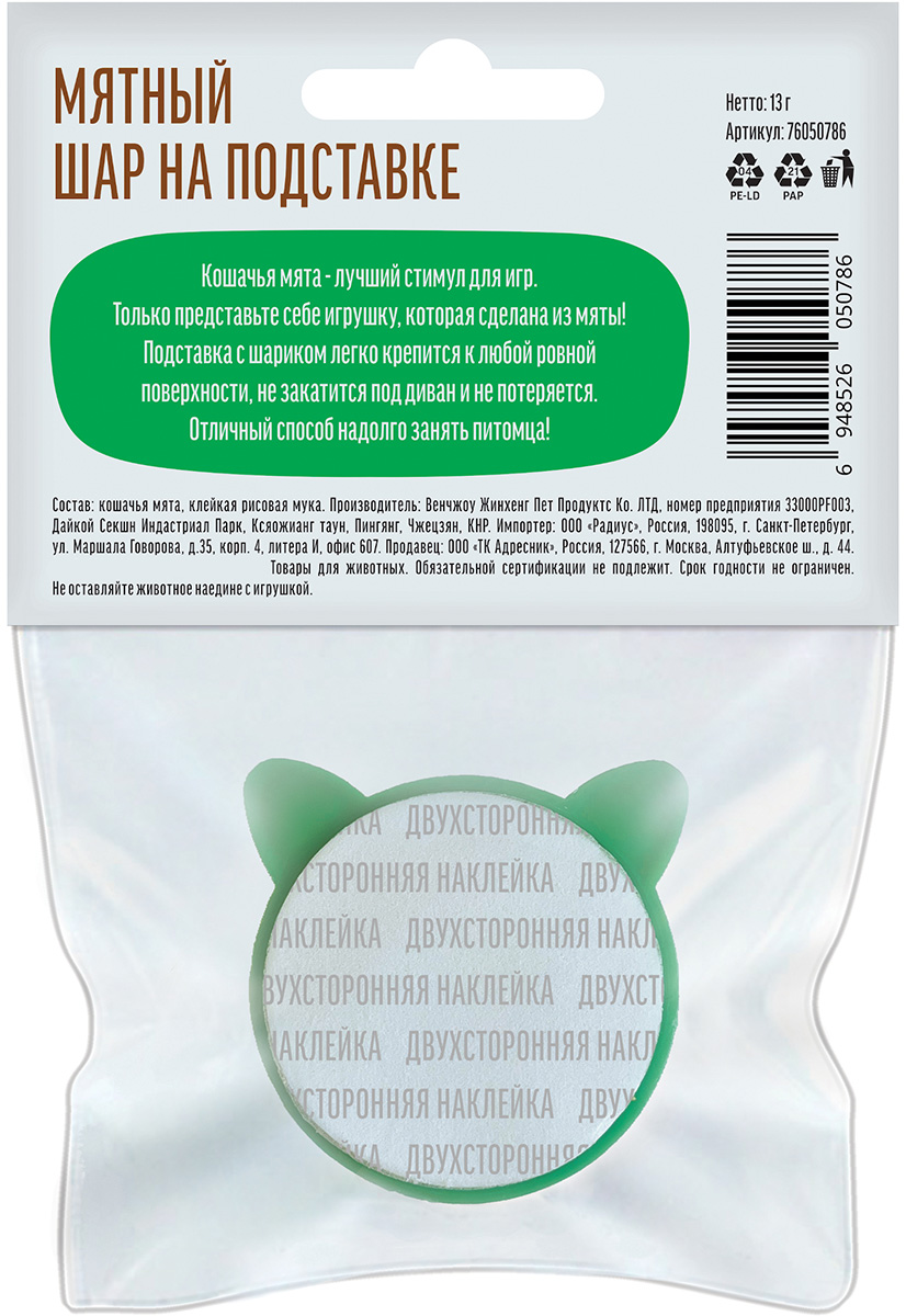 Подставка с шариком легко крепится к ровной поверхности, не закатится под диван и не потеряется. Диаметр шара — 3 см. Эту игрушку можно даже съесть. Она состоит только из натуральных ингредиентов. Ваша кошка получит огромное удовольствие.