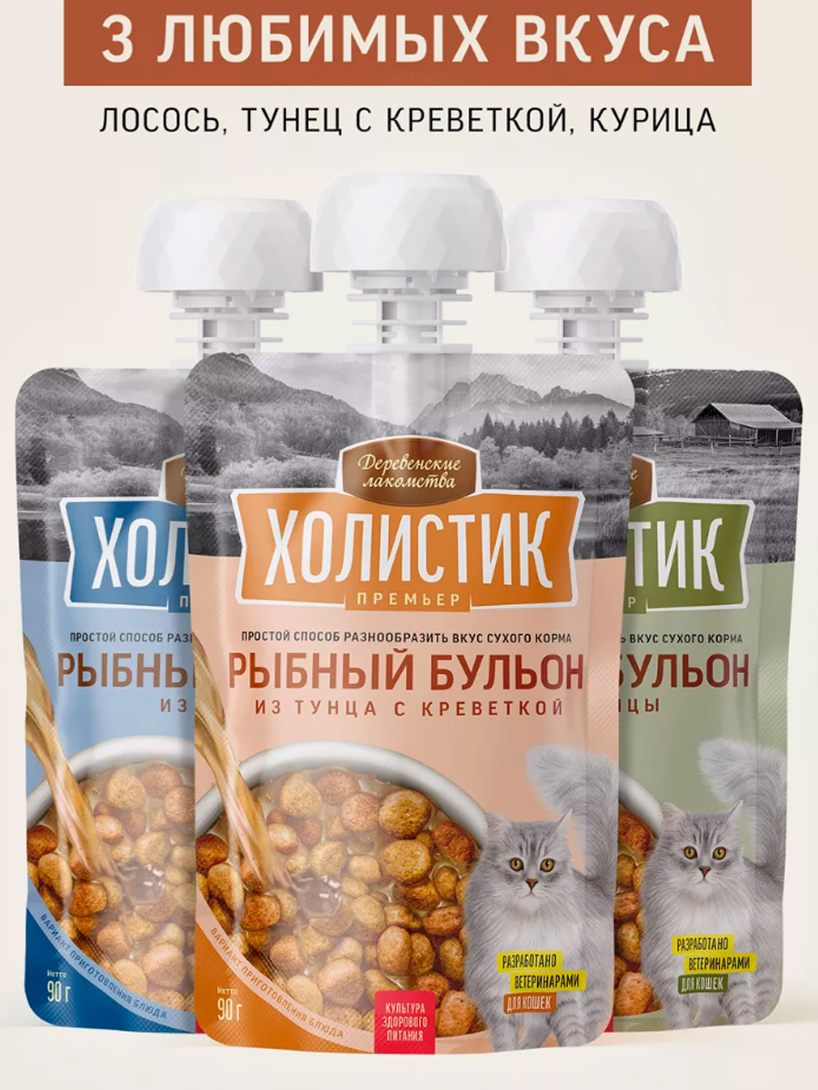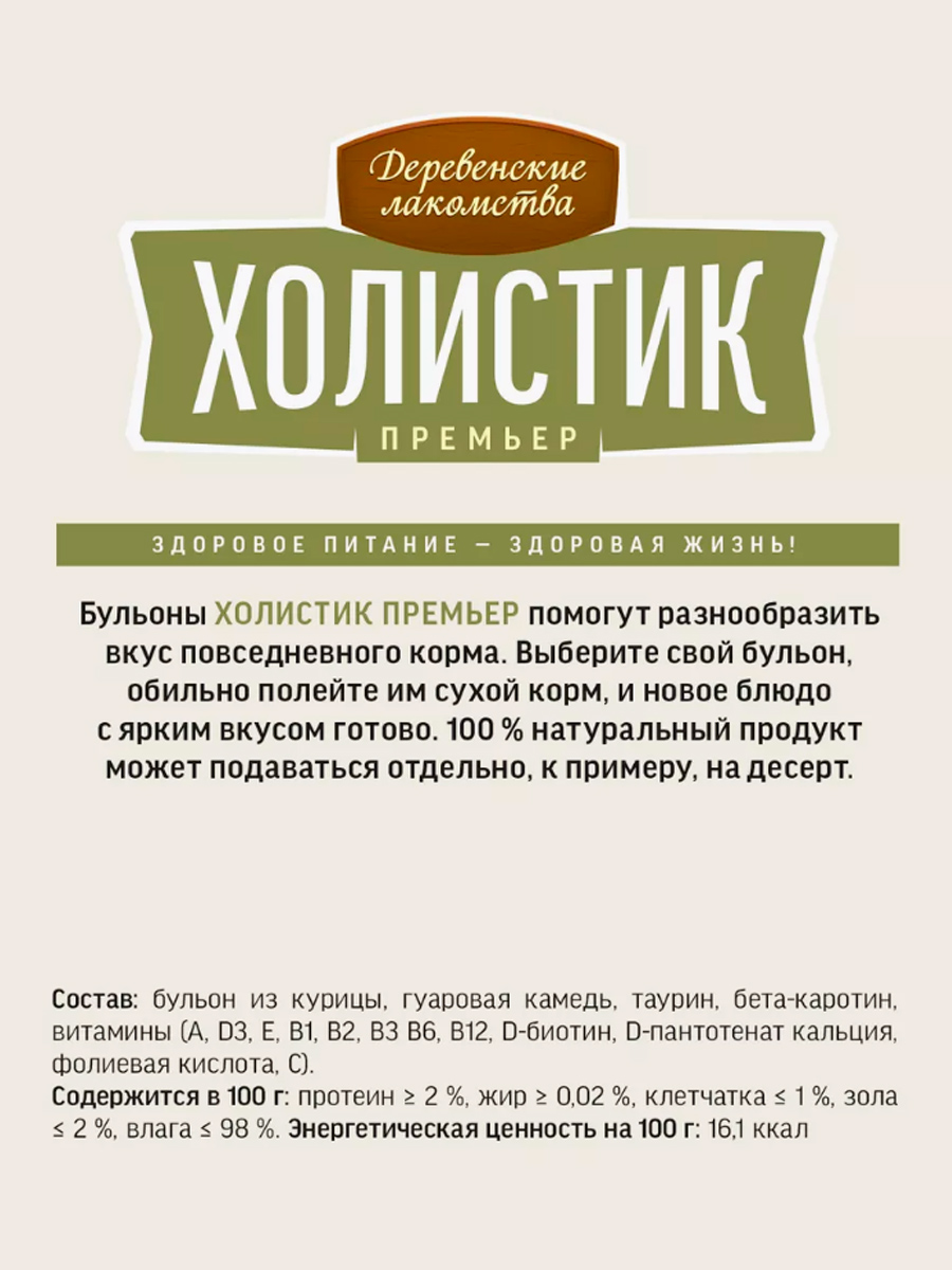Бульоны Деревенские Лакомства Холистик Премьер помогут разнообразить вкус повседневного корма.