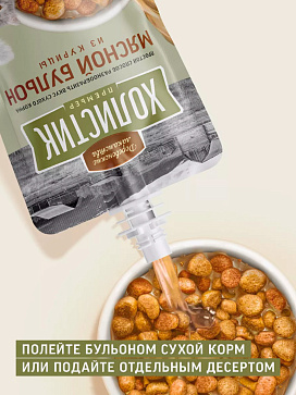 Выберите свой бульон, обильно полейте им сухой корм, и новое блюдо с ярким вкусом готово. 100 % натуральный продукт может подаваться отдельно, к примеру, на десерт.