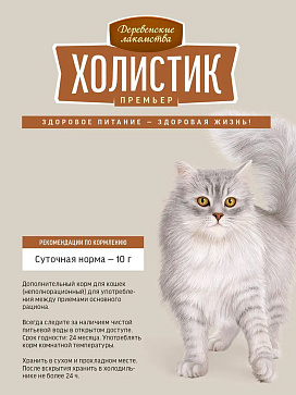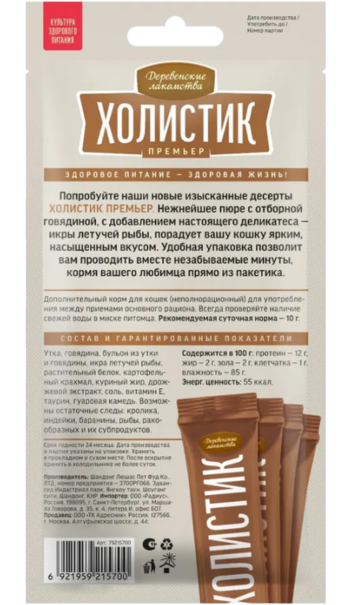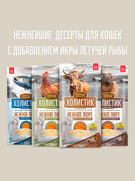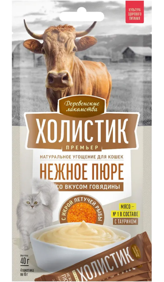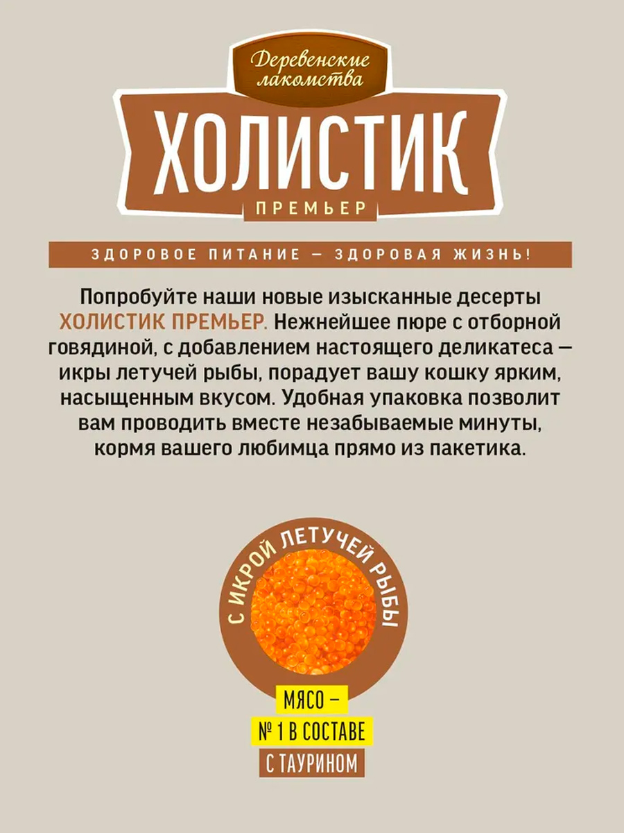 Лакомства для кошек ДЕРЕВЕНСКИЕ ХОЛИСТИК ПРЕМЬЕР пюре говядина, икра летучей рыбы 40 гр (1 шт)