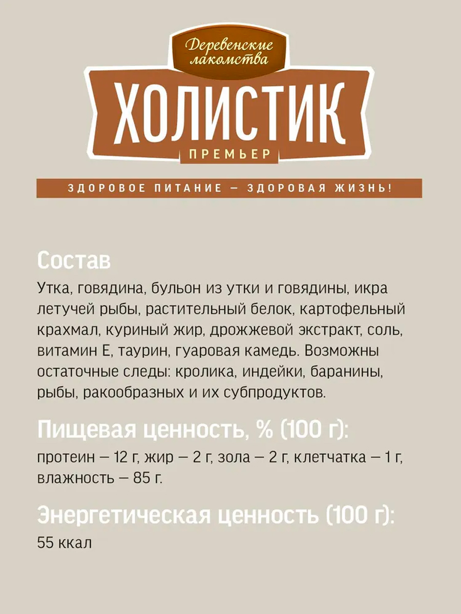 Изысканный десерт Деревенские Лакомства Холистик Премьер, нежнейшее пюре со вкусом говядины с добавлением настоящего деликатеса - икры летучей рыбы