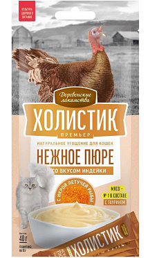 Лакомства для кошек ДЕРЕВЕНСКИЕ ХОЛИСТИК ПРЕМЬЕР пюре индейка, икра летучей рыбы 40 гр (1 шт)