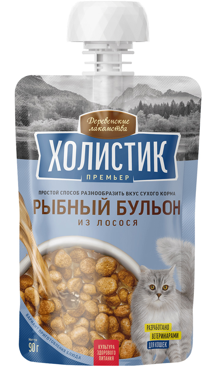 Лакомства для кошек ДЕРЕВЕНСКИЕ ХОЛИСТИК ПРЕМЬЕР РЫБНЫЙ БУЛЬОН лосось (90 гр)
