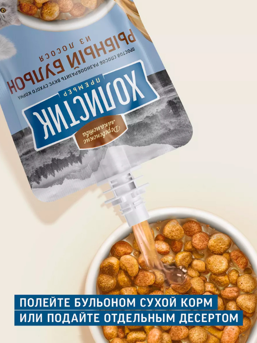 Выберите свой бульон, обильно полейте им сухой корм, и новое блюдо с ярким вкусом готово. 100 % натуральный продукт может подаваться отдельно, к примеру, на десерт.