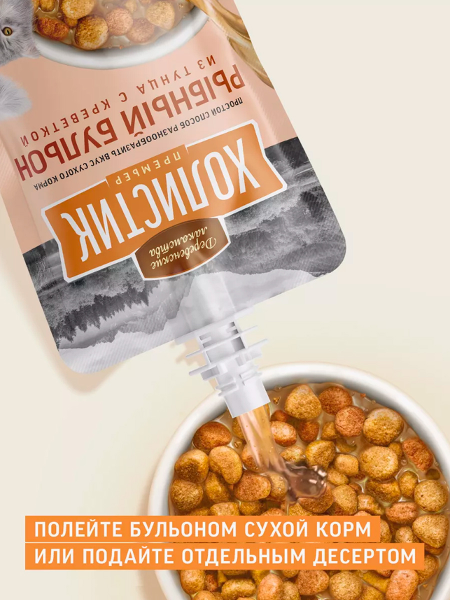Выберите свой бульон, обильно полейте им сухой корм, и новое блюдо с ярким вкусом готово. 100 % натуральный продукт может подаваться отдельно, к примеру, на десерт.