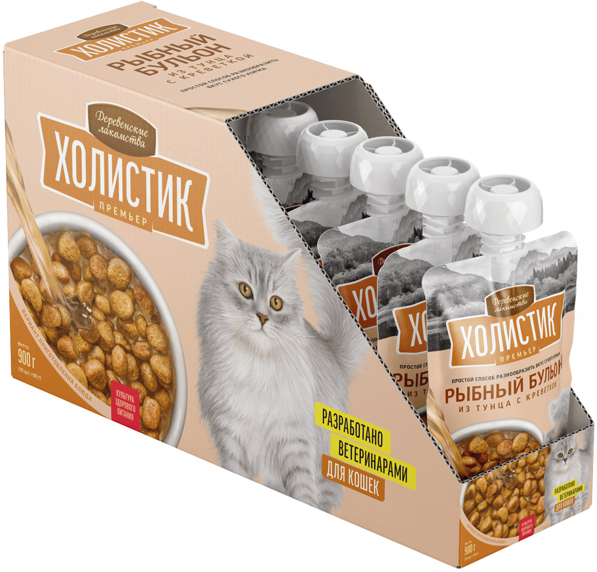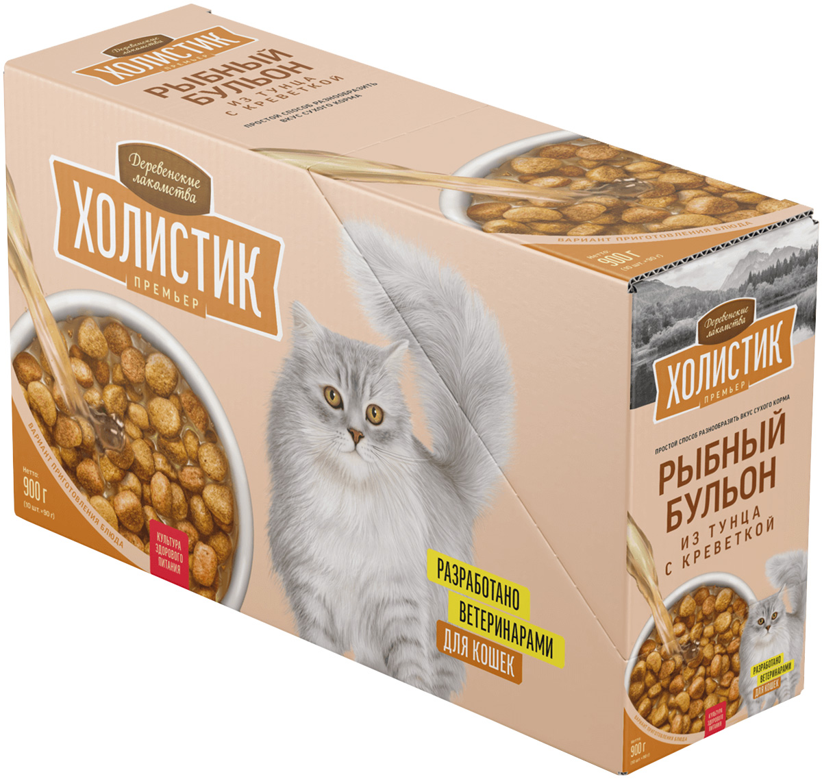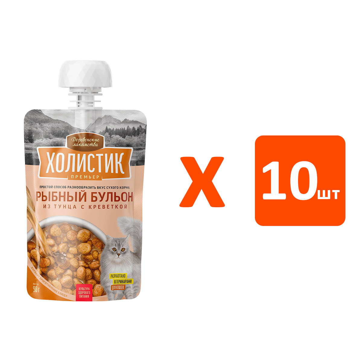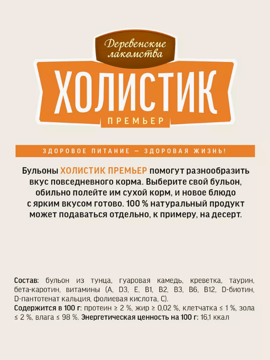 Лакомства для кошек ДЕРЕВЕНСКИЕ ХОЛИСТИК ПРЕМЬЕР РЫБНЫЙ БУЛЬОН тунец, креветки (90 гр х 10 шт)