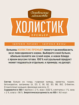 Бульоны Деревенские Лакомства Холистик Премьер помогут разнообразить вкус повседневного корма.