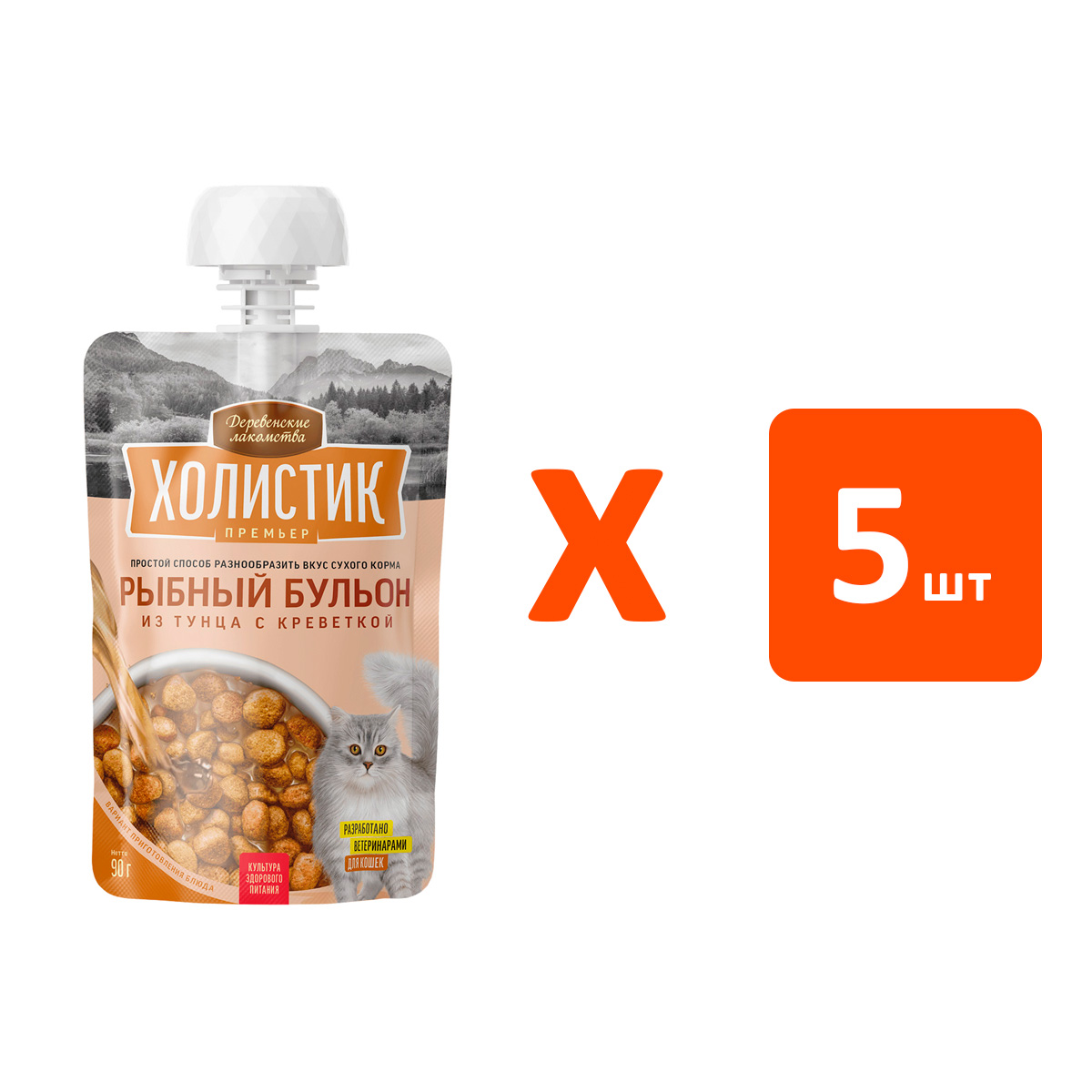 Лакомства для кошек ДЕРЕВЕНСКИЕ ХОЛИСТИК ПРЕМЬЕР РЫБНЫЙ БУЛЬОН тунец, креветки (90 гр х 5 шт)