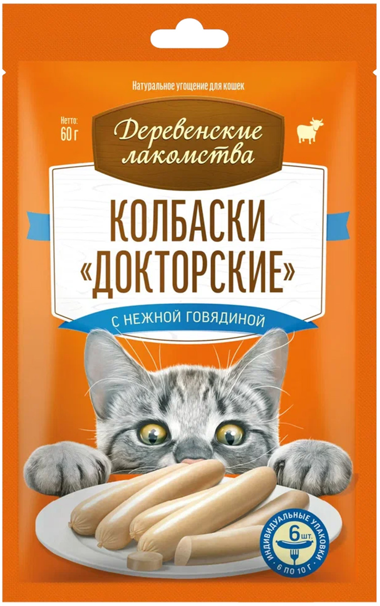 Лакомства для кошек ДЕРЕВЕНСКИЕ колбаски докторские говядина 60 гр (1 шт)Возраст питомца