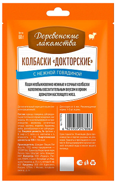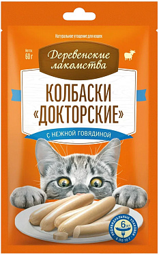 Лакомства для кошек ДЕРЕВЕНСКИЕ колбаски докторские говядина 60 гр (1 шт)