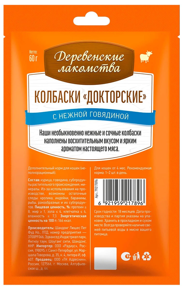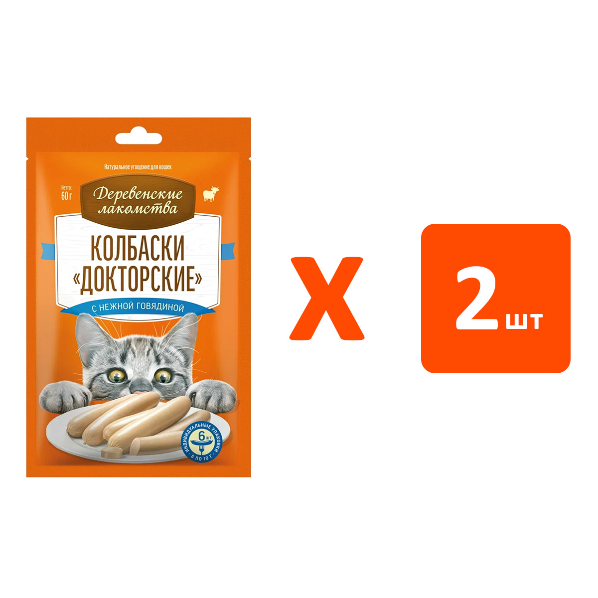 Лакомства для кошек ДЕРЕВЕНСКИЕ колбаски докторские говядина 60 гр (1 шт х 2)Возраст питомца