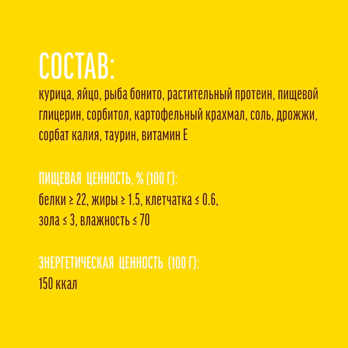 Курица, яйцо, рыба бонито, растительный протеин, пищевой глицерин, сорбитол, картофельный крахмал, соль, дрожжи, сорбат калия, таурин, витамин E.