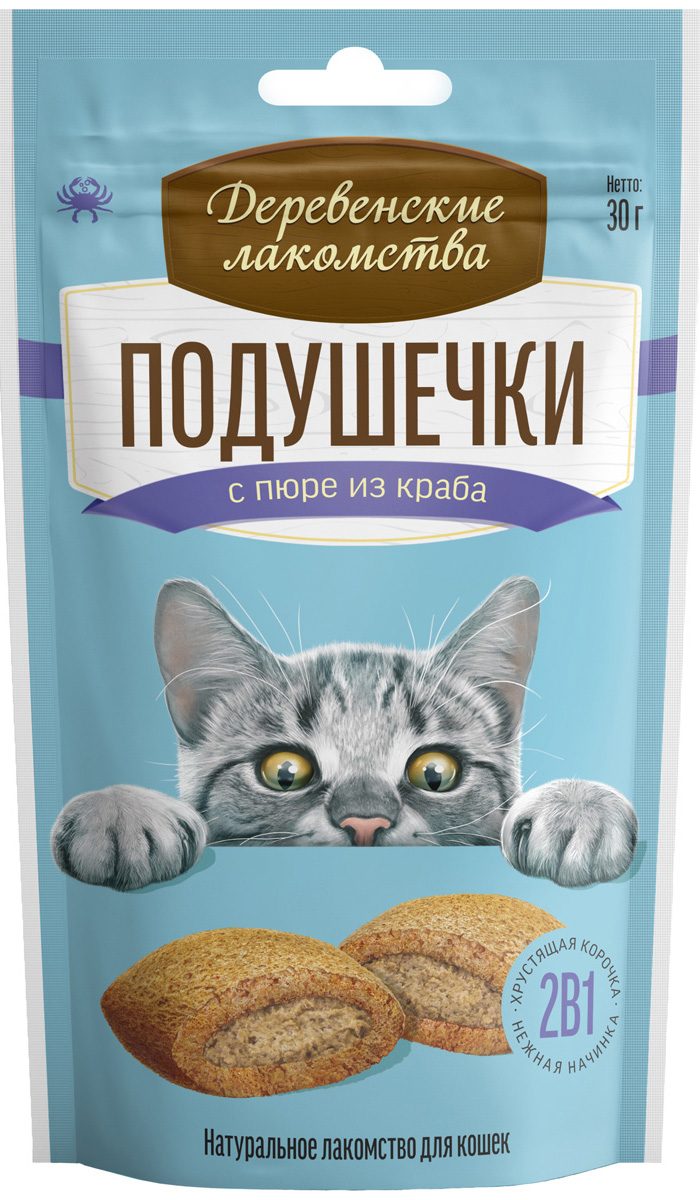 Лакомства для кошек ДЕРЕВЕНСКИЕ подушечки с пюре из краба 30 гр (1 шт)