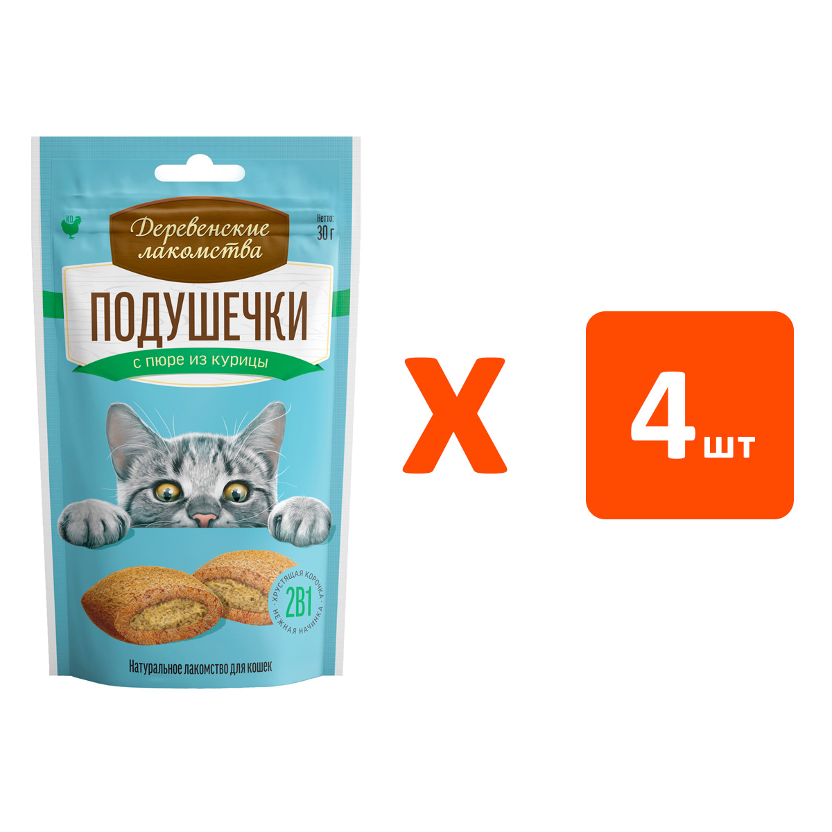Лакомства для кошек ДЕРЕВЕНСКИЕ подушечки с пюре из курицы 30 гр (1 шт х 4)