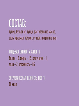 Тунец, бульон из тунца, растительное масло, соль, крахмал, таурин, гуаран, нитрит натрия.