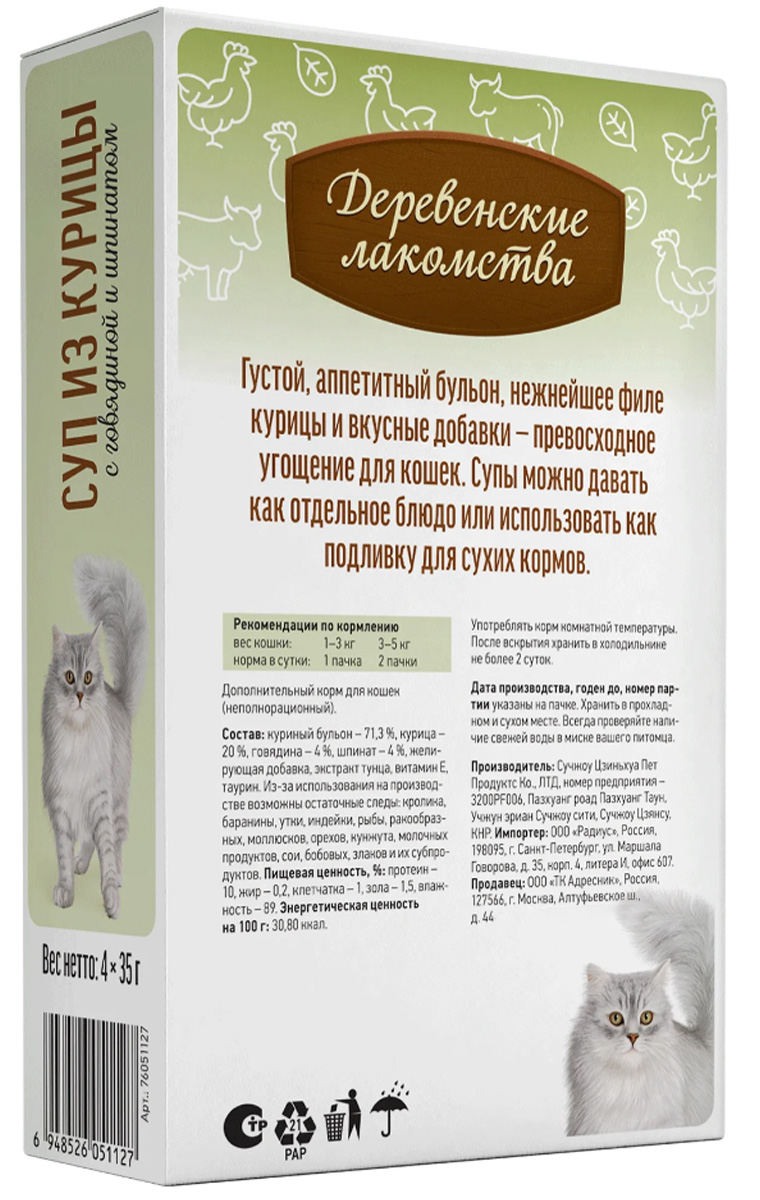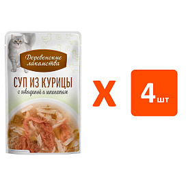 Лакомства для кошек ДЕРЕВЕНСКИЕ СУП набор паучей курица, говядина, шпинат (35 гр х 4 шт)