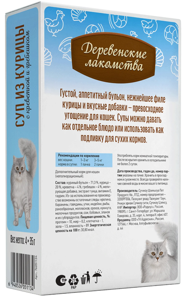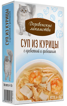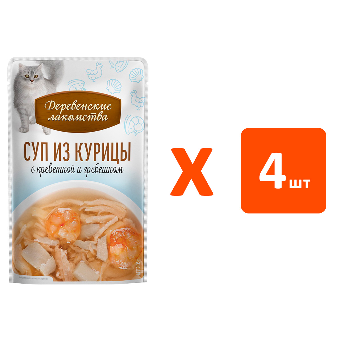 Лакомства для кошек ДЕРЕВЕНСКИЕ СУП набор паучей курица, креветка, гребешок (35 гр х 4 шт)