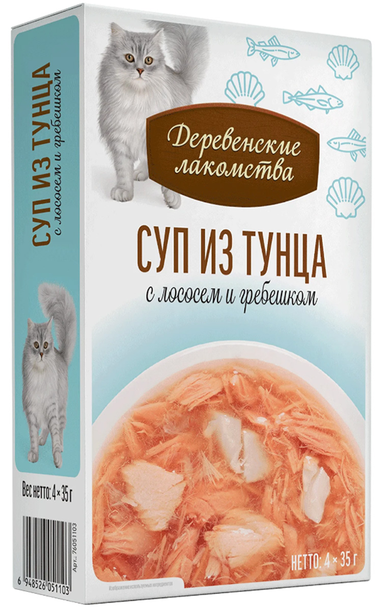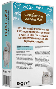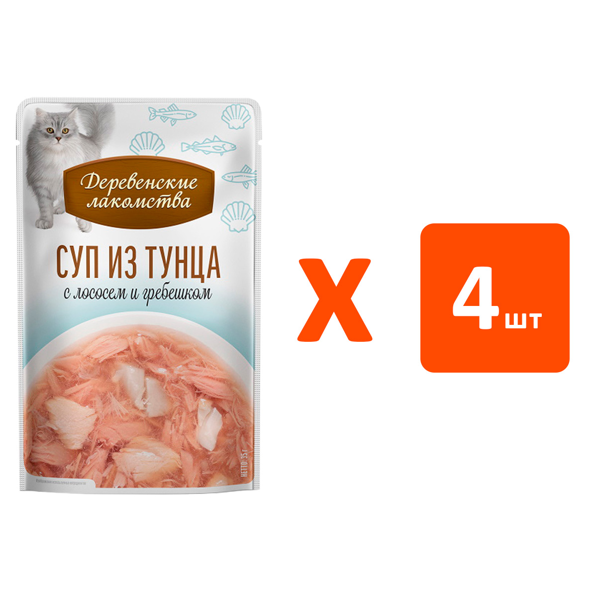 Лакомства для кошек ДЕРЕВЕНСКИЕ СУП набор паучей тунец, лосось, гребешок (35 гр х 4 шт)