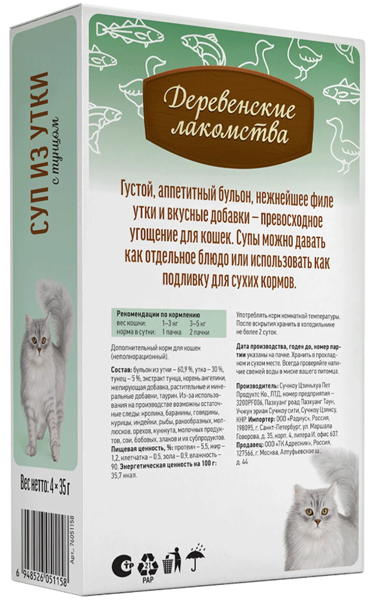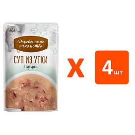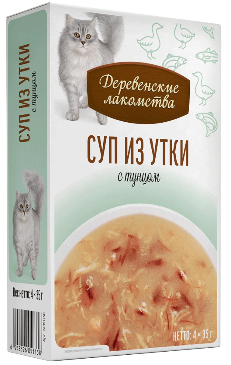 Лакомства для кошек ДЕРЕВЕНСКИЕ СУП набор паучей утка, тунец (35 гр х 4 шт)