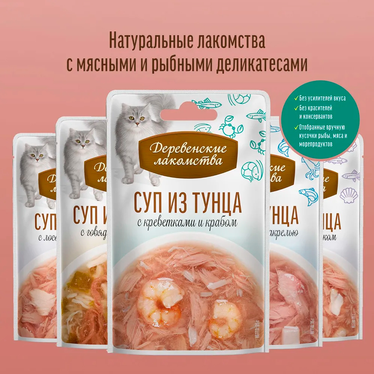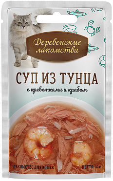 Лакомства для кошек ДЕРЕВЕНСКИЕ СУП тунец, креветки, краб (35 гр)