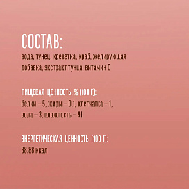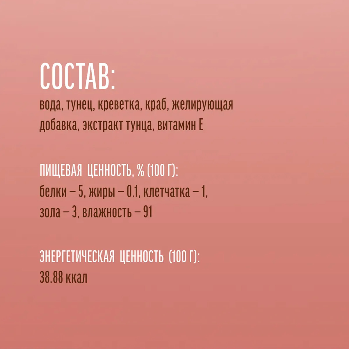 Вода, тунец, креветка, краб, желирующая добавка, экстракт тунца, витамин Е.