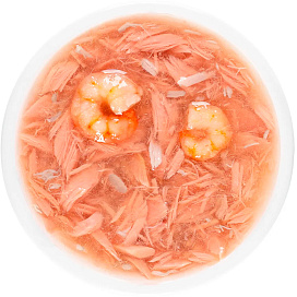 Восхитительное лакомство для кошек в виде супа с тунцом, креветками и крабом в густом аппетитном бульоне.