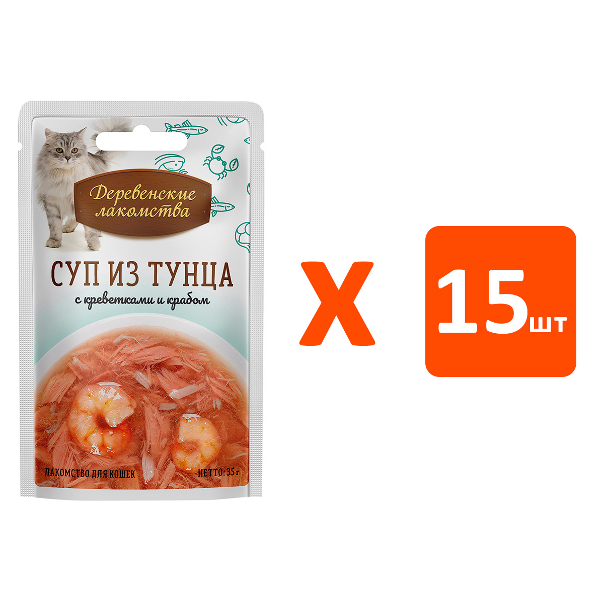 Лакомства для кошек ДЕРЕВЕНСКИЕ СУП тунец, креветки, краб (35 гр х 15 шт)