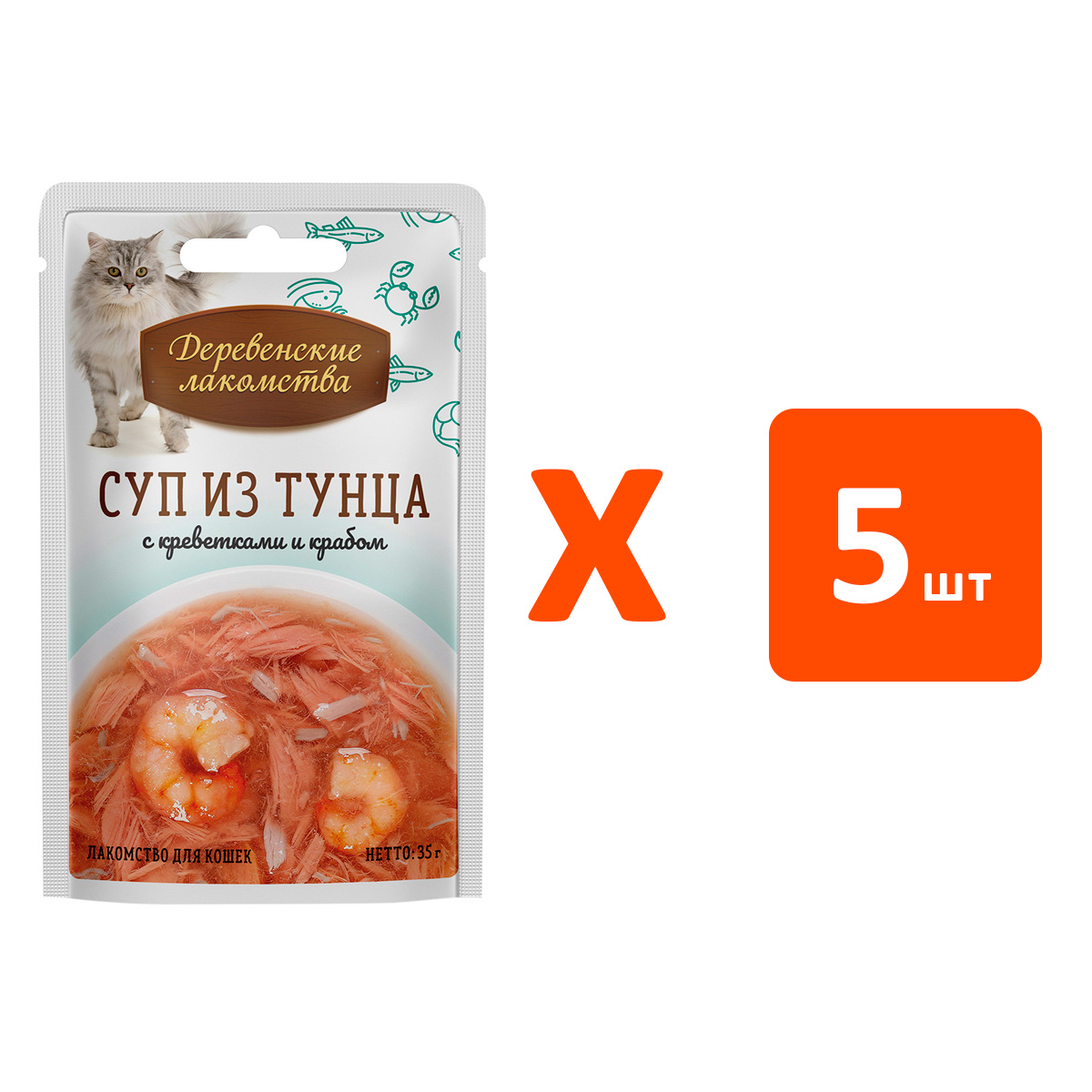 Лакомства для кошек ДЕРЕВЕНСКИЕ СУП тунец, креветки, краб (35 гр х 5 шт)