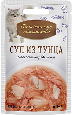 Лакомства для кошек ДЕРЕВЕНСКИЕ СУП тунец, лосось, гребешок (35 гр)