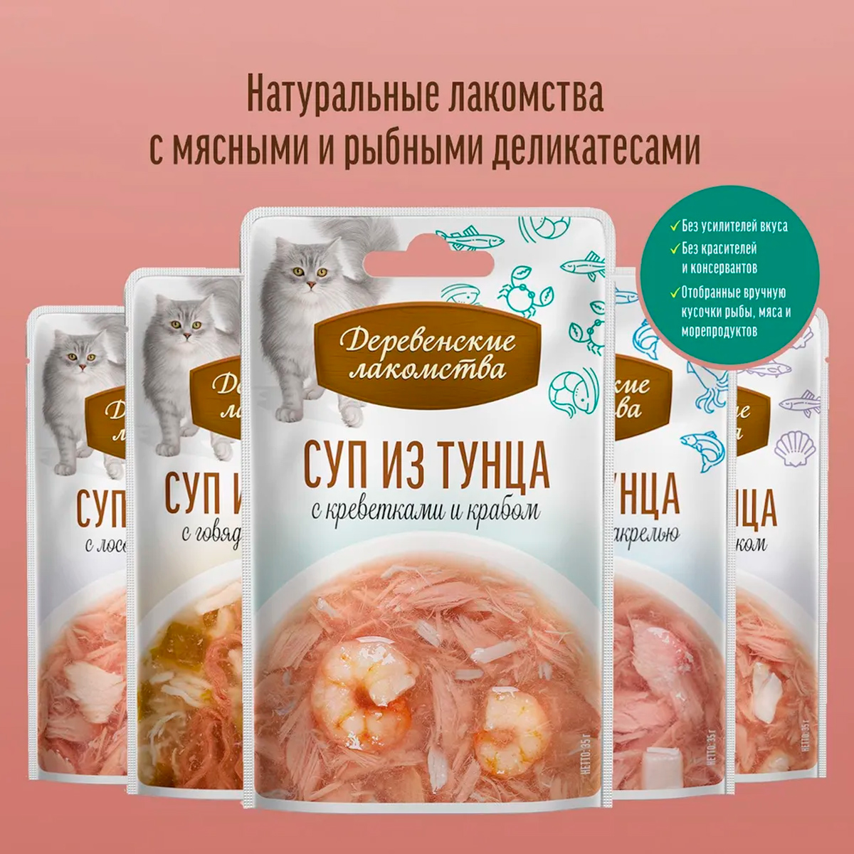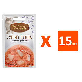 Лакомства для кошек ДЕРЕВЕНСКИЕ СУП тунец, лосось, гребешок (35 гр х 15 шт)