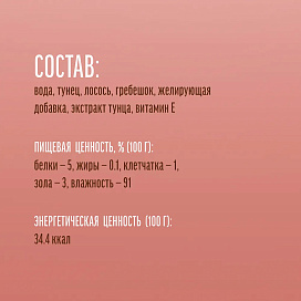 Состав: вода, тунец, лосось, гребешок, желирующая добавка, экстракт тунца, витамин Е.