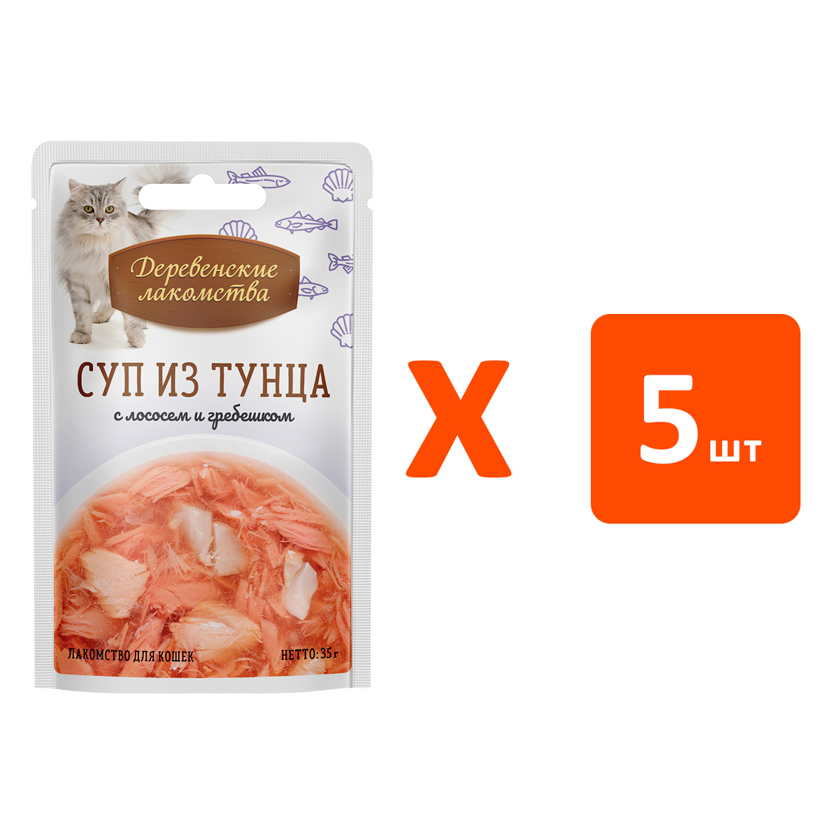 Лакомства для кошек ДЕРЕВЕНСКИЕ СУП тунец, лосось, гребешок (35 гр х 5 шт)