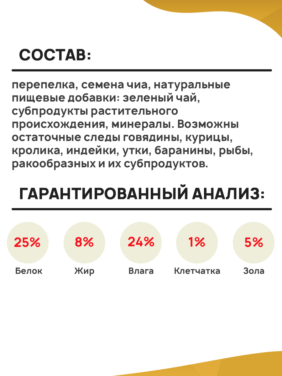 Состав: перепелка, семена чиа, натуральные пищевые добавки: зеленый чай, субпродукты растительного происхождения, минералы. Возможны остаточные следы говядины, курицы, кролика, индейки, утки, баранины, рыбы, ракообразных и их субпродуктов.