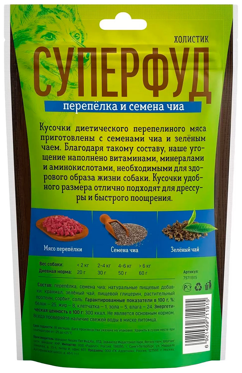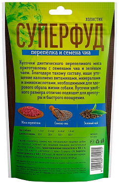 Кусочки диетического перепелиного мяса приготовлены с семенами чиа и зелёным чаем. Благодаря такому составу, наше угощение наполнено витаминами, минералами и аминокислотами, необходимыми для здорового образа жизни собаки. Кусочки удобного размера отлично подходят для дрессуры и быстрого поощрения.