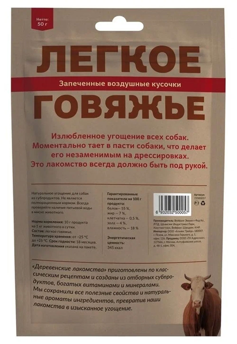 Лакомства для собак ДЕРЕВЕНСКИЕ КЛАССИЧЕСКИЕ РЕЦЕПТЫ легкое говяжье (50 гр)