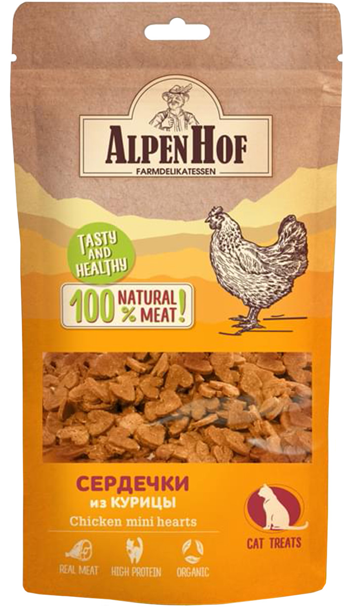 AlpenHof Сердечки из курицы — это натуральное мясное лакомство класса холистик. Аппетитные сердечки идеально подходит для любых пород кошек.