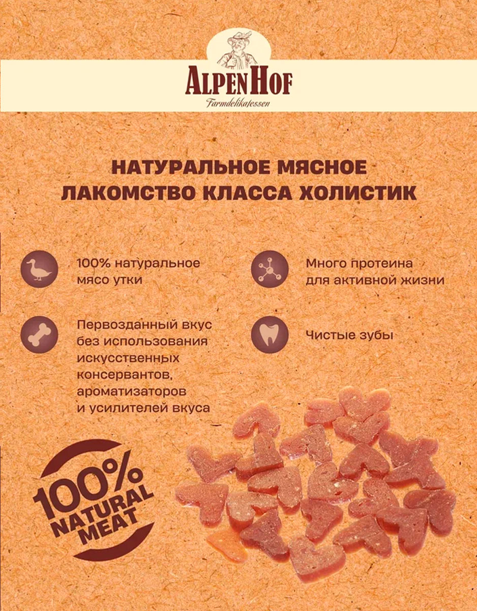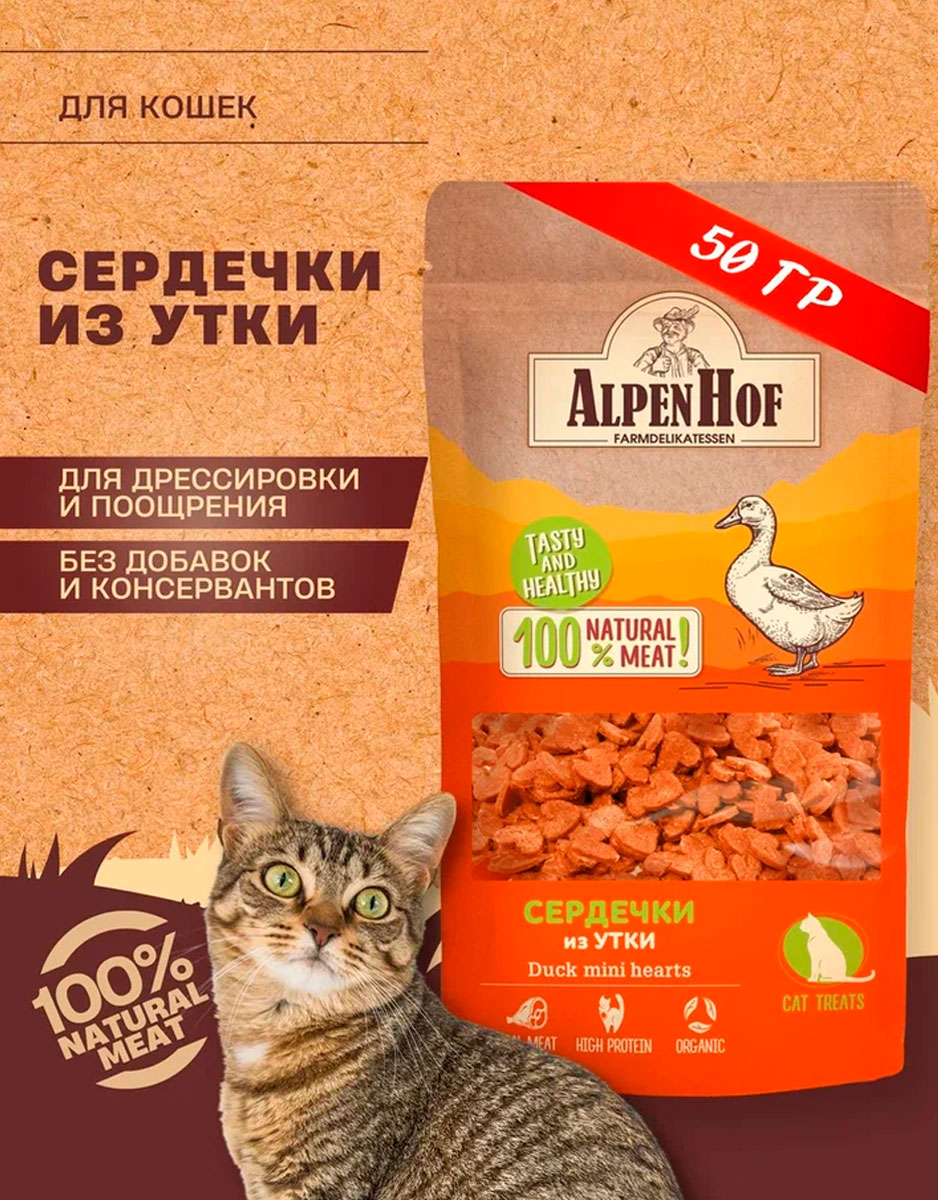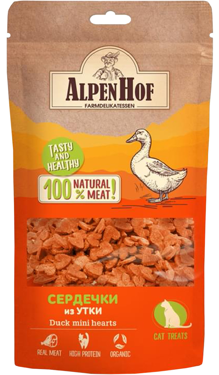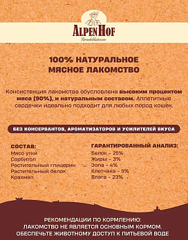 AlpenHof Сердечки из утки — это натуральное мясное лакомство класса холистик. Аппетитные сердечки идеально подходит для любых пород кошек.