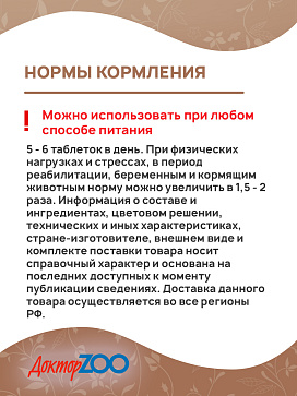 Способ применения: 5 - 6 таблеток в день. При физических нагрузках и стрессах, в период реабилитации, беременным и кормящим животным норму можно увеличить в 1,5 - 2 раза.