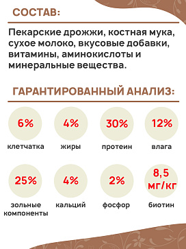 Пекарские дрожжи, костная мука, сухое молоко, вкусовые добавки, витамины, аминокислоты и минеральные вещества.