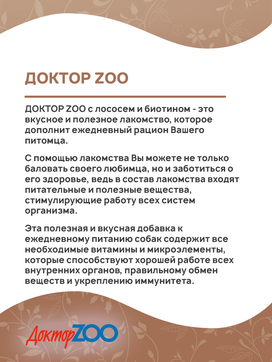 ДОКТОР ZOO со вкусом лосося и биотином – это вкусное и полезное лакомство, которое дополнит ежедневный рацион Вашего питомца.