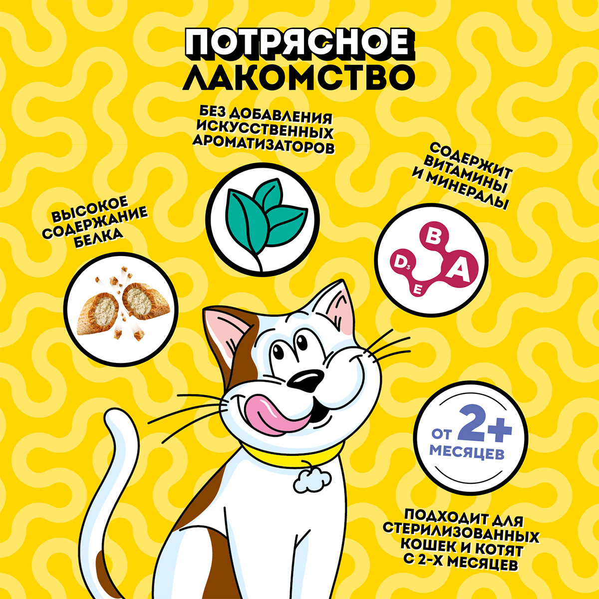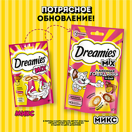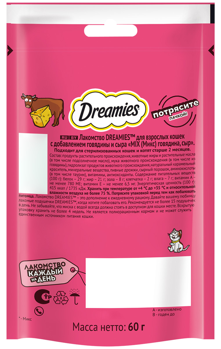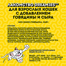 Яркое сочетание любимых вкусов, которое не оставит равнодушным вашего питомца! Давайте вашему котику лакомые подушечки DREAMIES, когда хотите побаловать его. В состав лакомства входят важные для кошки питательные вещества, витамины и минералы, а значит, такое угощение приносит не только радость, но и пользу.