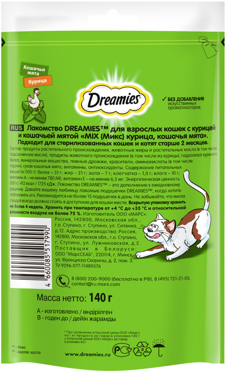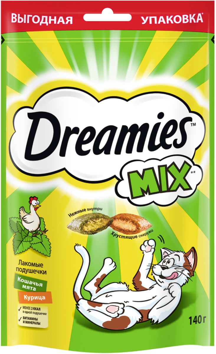 Попробуйте DREAMIES с курицей, говядиной, сыром, лососем, уткой и микс кошачьей мяты и курицы, чтобы Ваш любимец каждый день наслаждался разнообразием вкусов!
