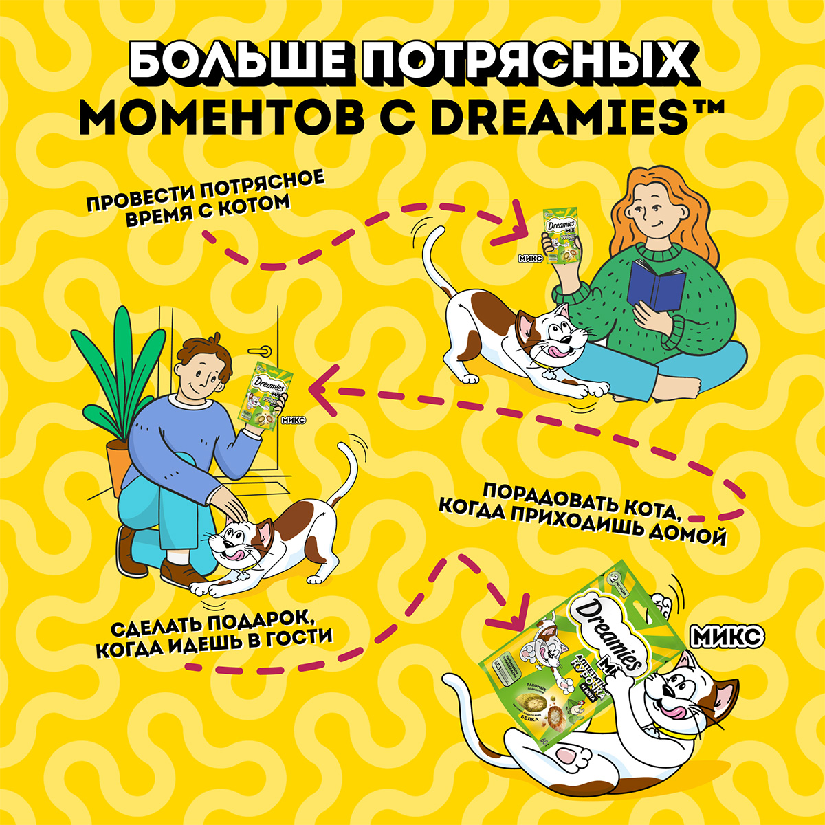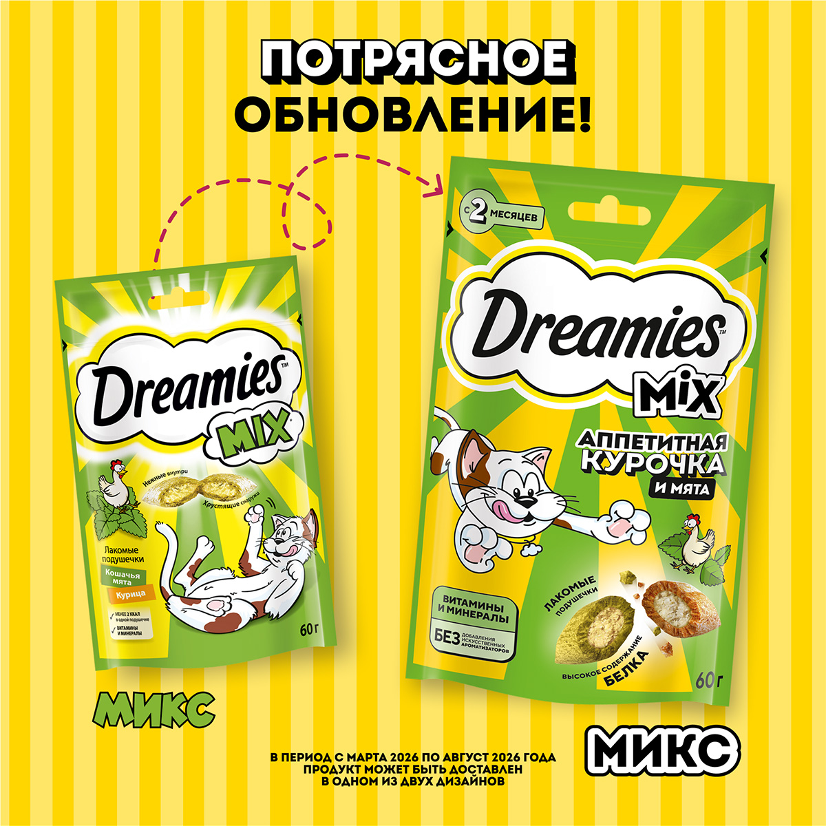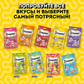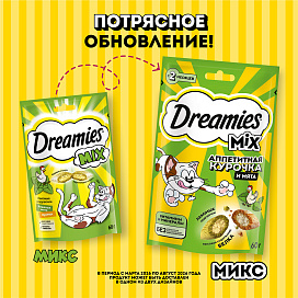 Лакомство для кошек DREAMIES "MIX (Микс) курица, кошачья мята" - это достойная награда вашему любимому зверю.