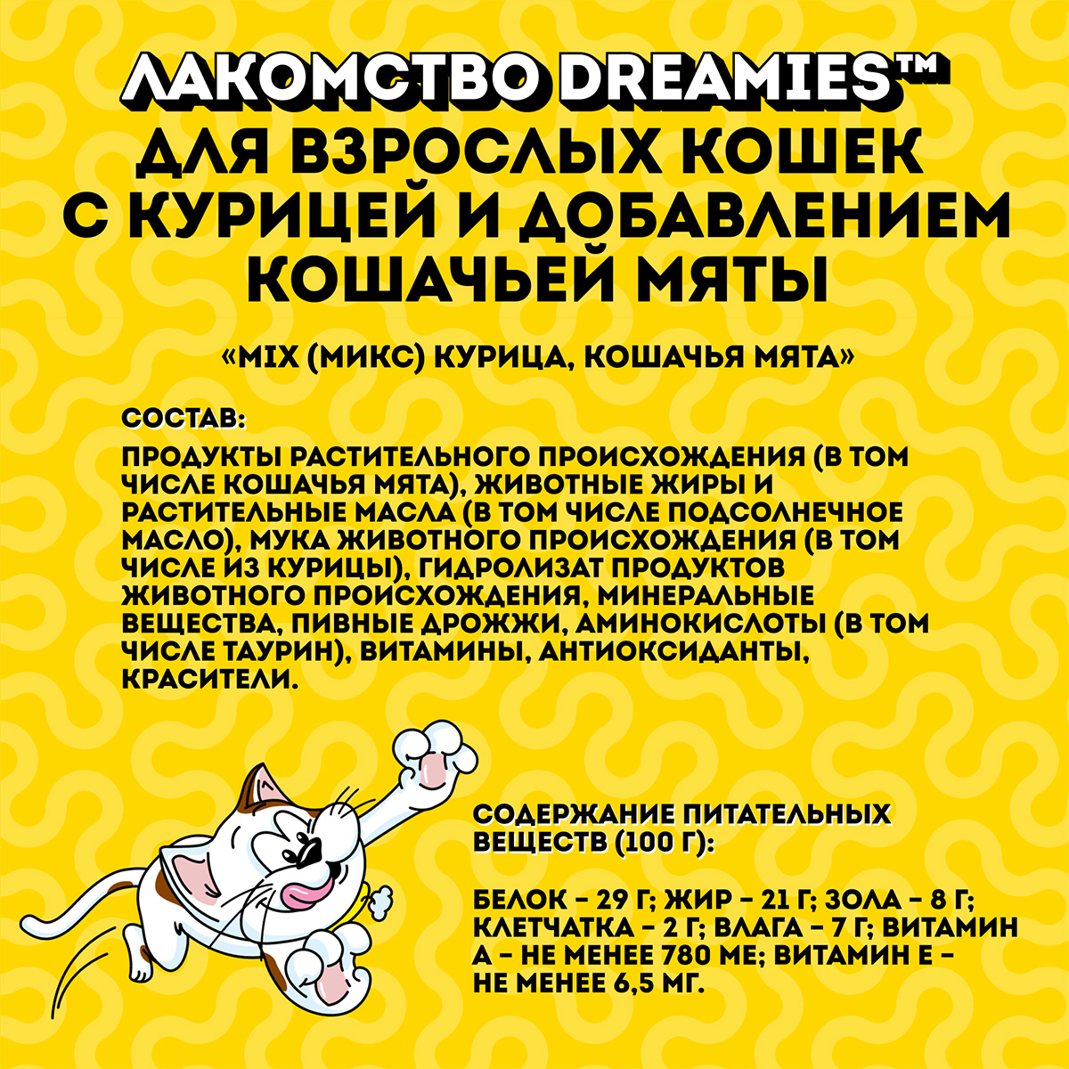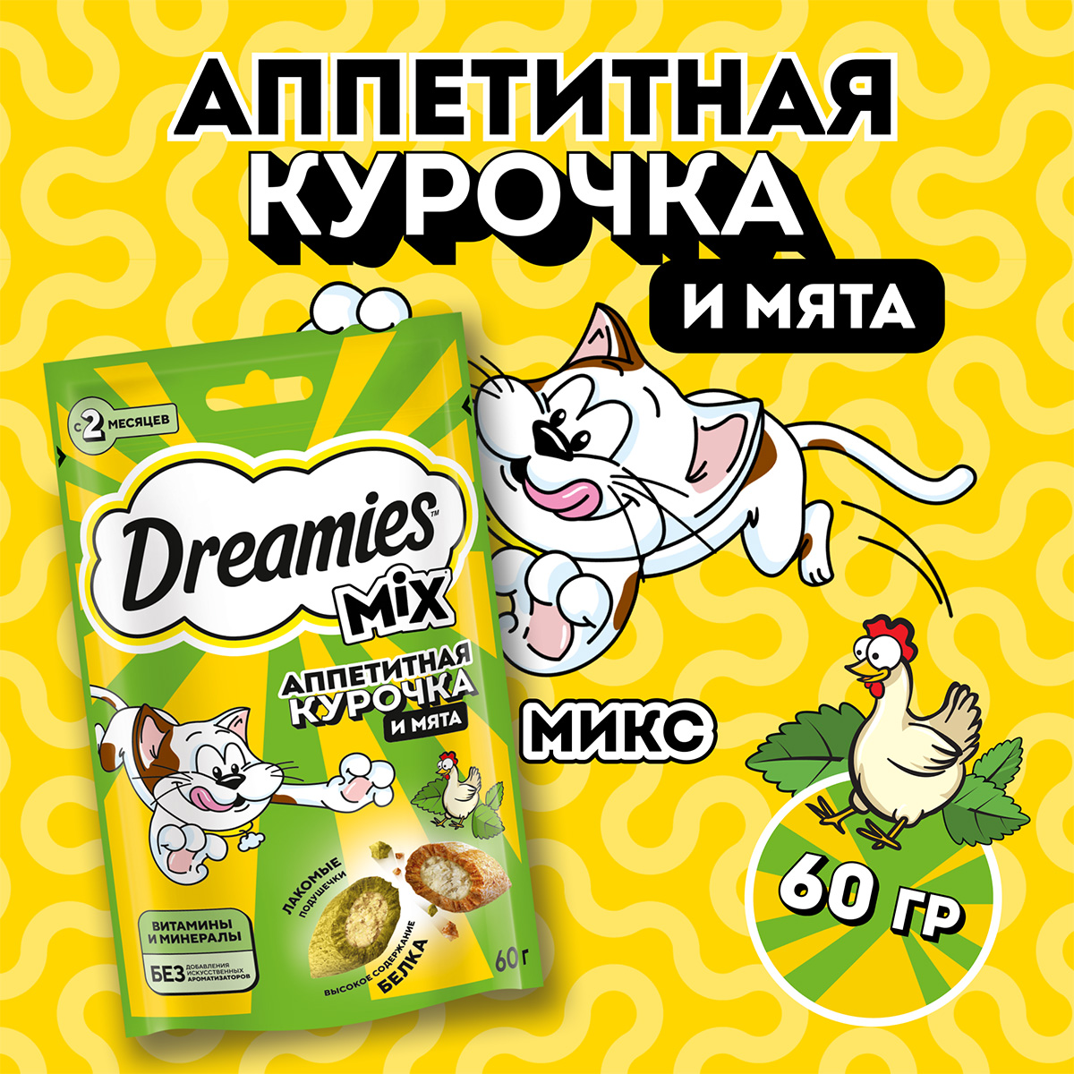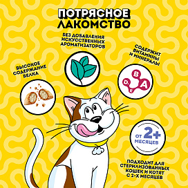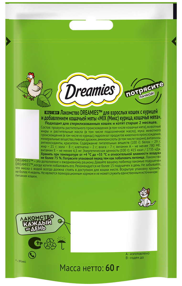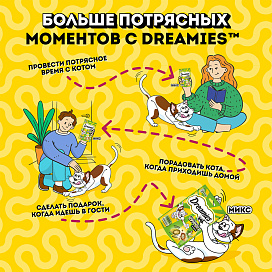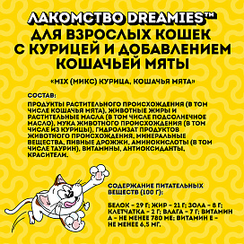 Любимая котиками кошачья мята в сочетании с аппетитной курочкой не оставит равнодушным вашего любимца. Давайте вашему котику лакомые подушечки DREAMIES, когда хотите побаловать его. В состав лакомства входят важные для кошки питательные вещества, витамины и минералы, а значит, такое угощение приносит не только радость, но и пользу.