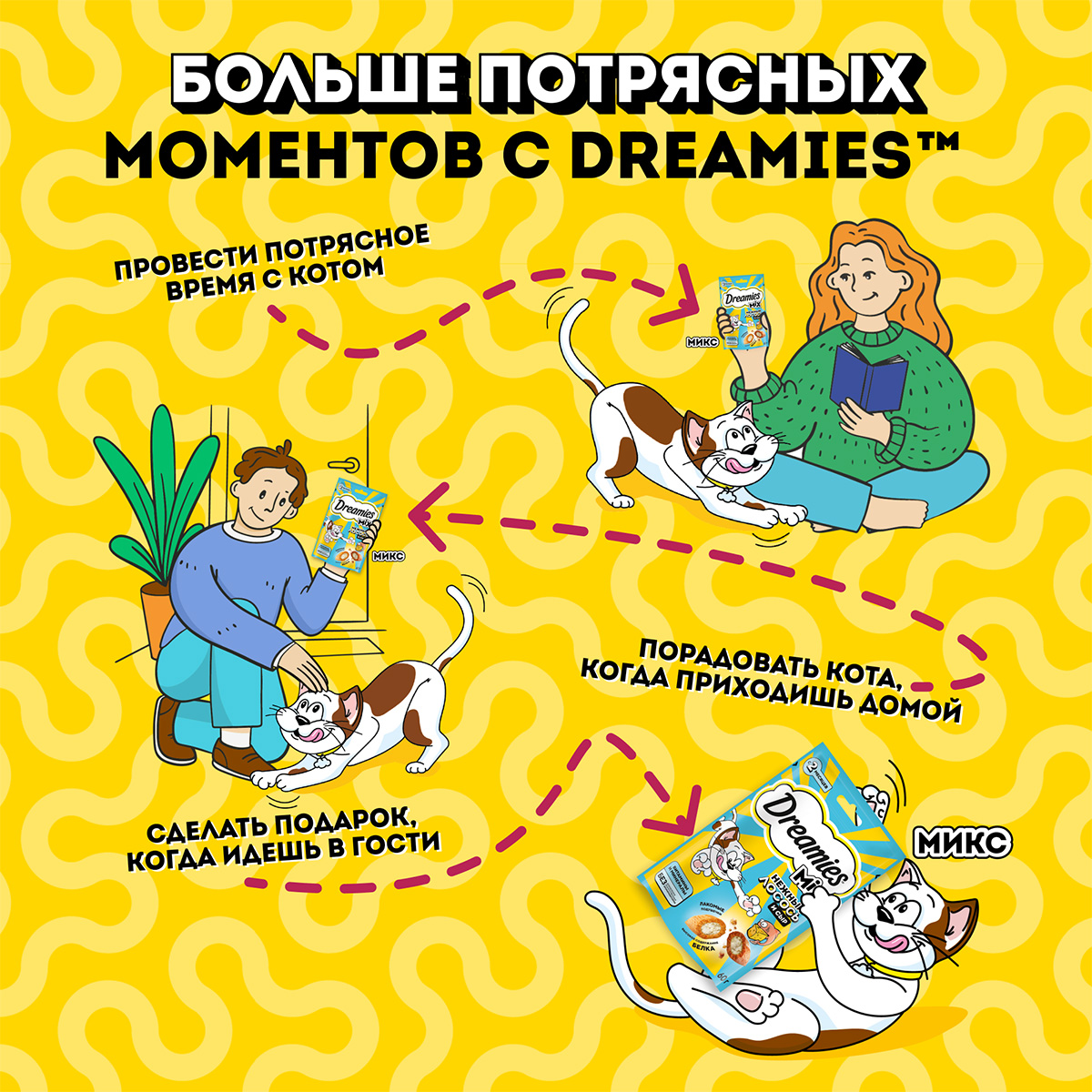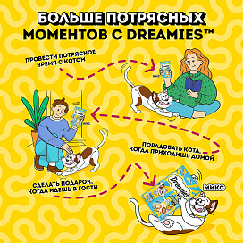 Необычное сочетание любимых вкусов, которое не оставит равнодушным вашего питомца! Давайте вашему котику лакомые подушечки DREAMIES, когда хотите побаловать его. В состав лакомства входят важные для кошки питательные вещества, витамины и минералы, а значит, такое угощение приносит не только радость, но и пользу.