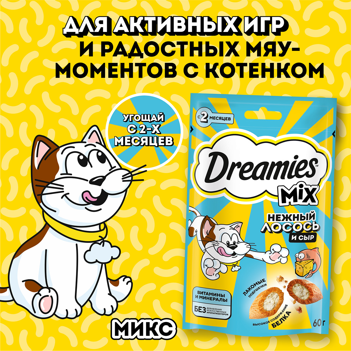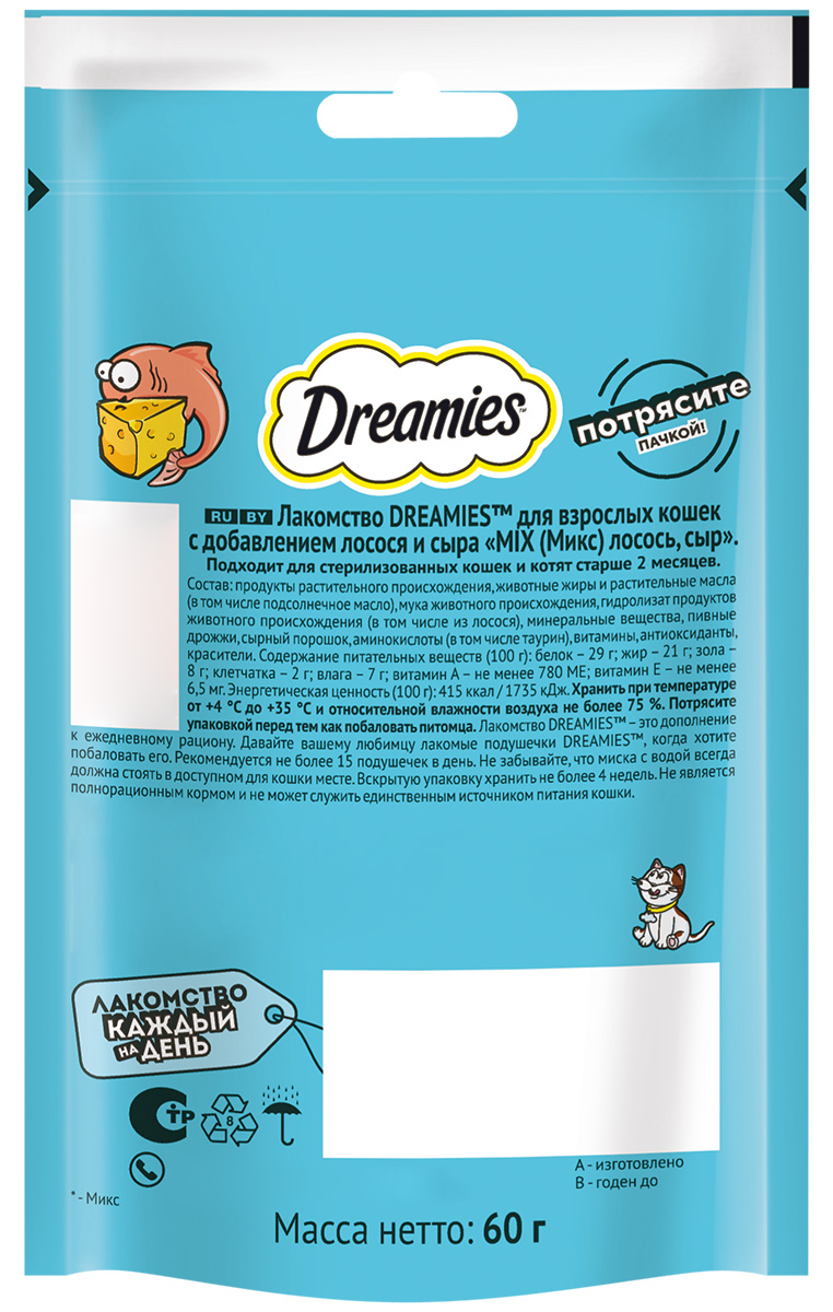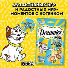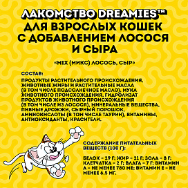 Лакомство для кошек DREAMIES "MIX (Микс) лосось, сыр" – это достойная награда вашему любимому зверю.