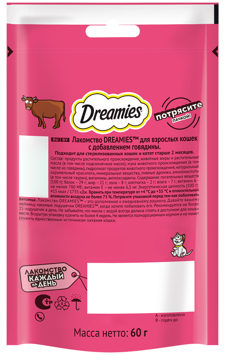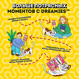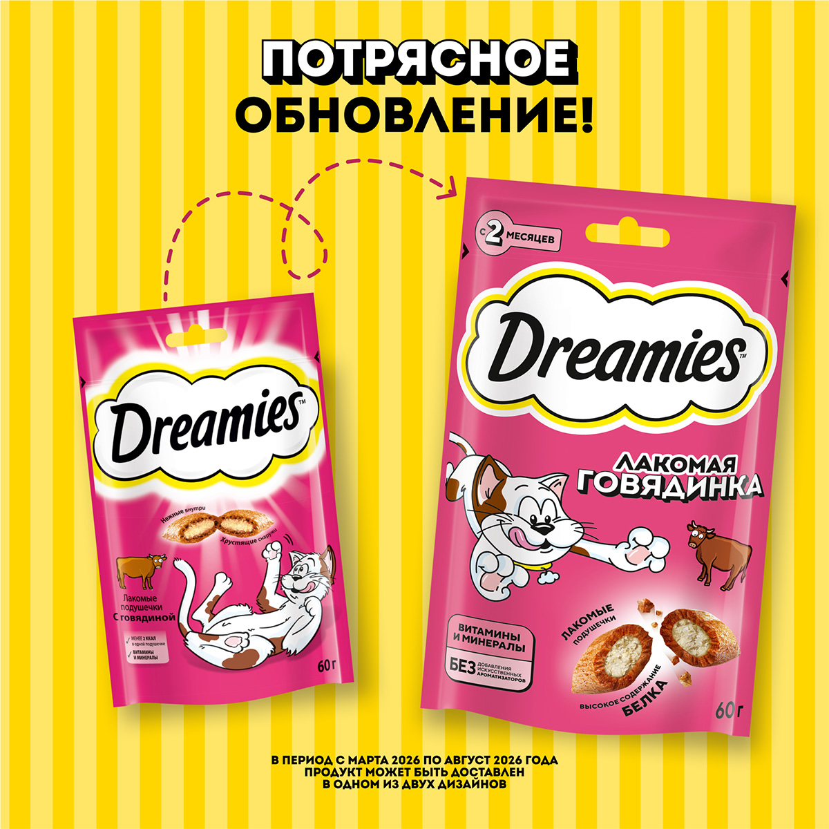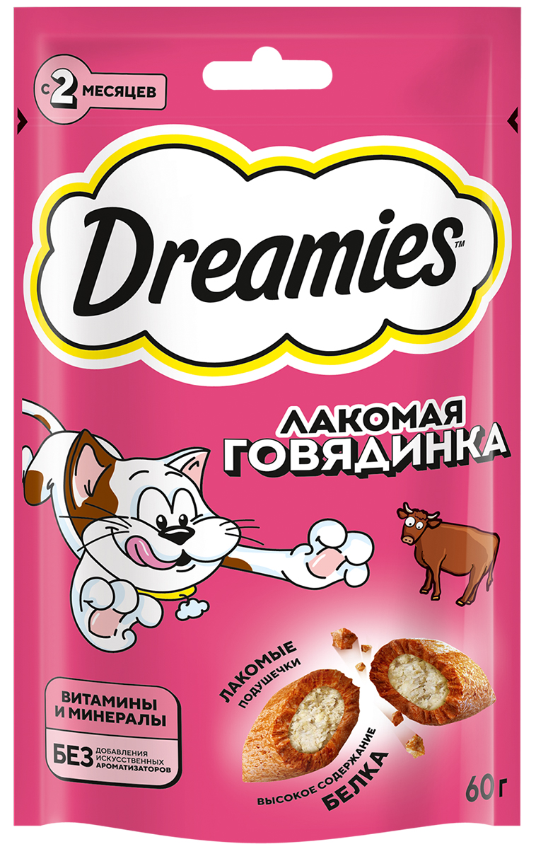 Лакомая говядинка в хрустящей вкусной подушечке не оставит равнодушным вашего питомца! Устройте ему настоящий праздник мяса! Давайте вашему котику лакомые подушечки DREAMIES, когда хотите побаловать его. В состав лакомства входят важные для кошки питательные вещества, витамины и минералы, а значит, такое угощение приносит не только радость, но и пользу.